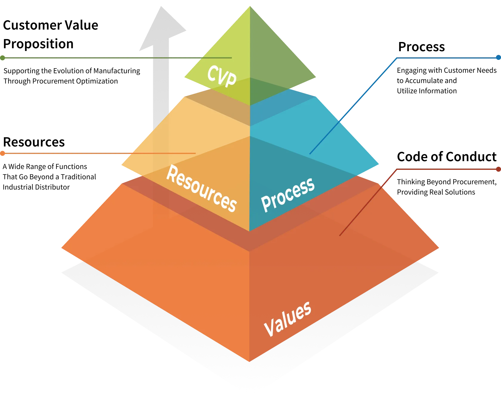 Securing raw materials and installing equipment are vital starting points in manufacturing, and these processes contain many challenges. To begin with, what best meets customer needs, and where is it found? Moreover, how do you deliver it at the right time, to the right place, in the right form? At Nichiden, we reframe the industrial distributor business model based on the power of proposals and procurement, supplementing what traditional industrial distributors lack with our own unique methods as we strive to serve as a partner in the evolution of manufacturing.