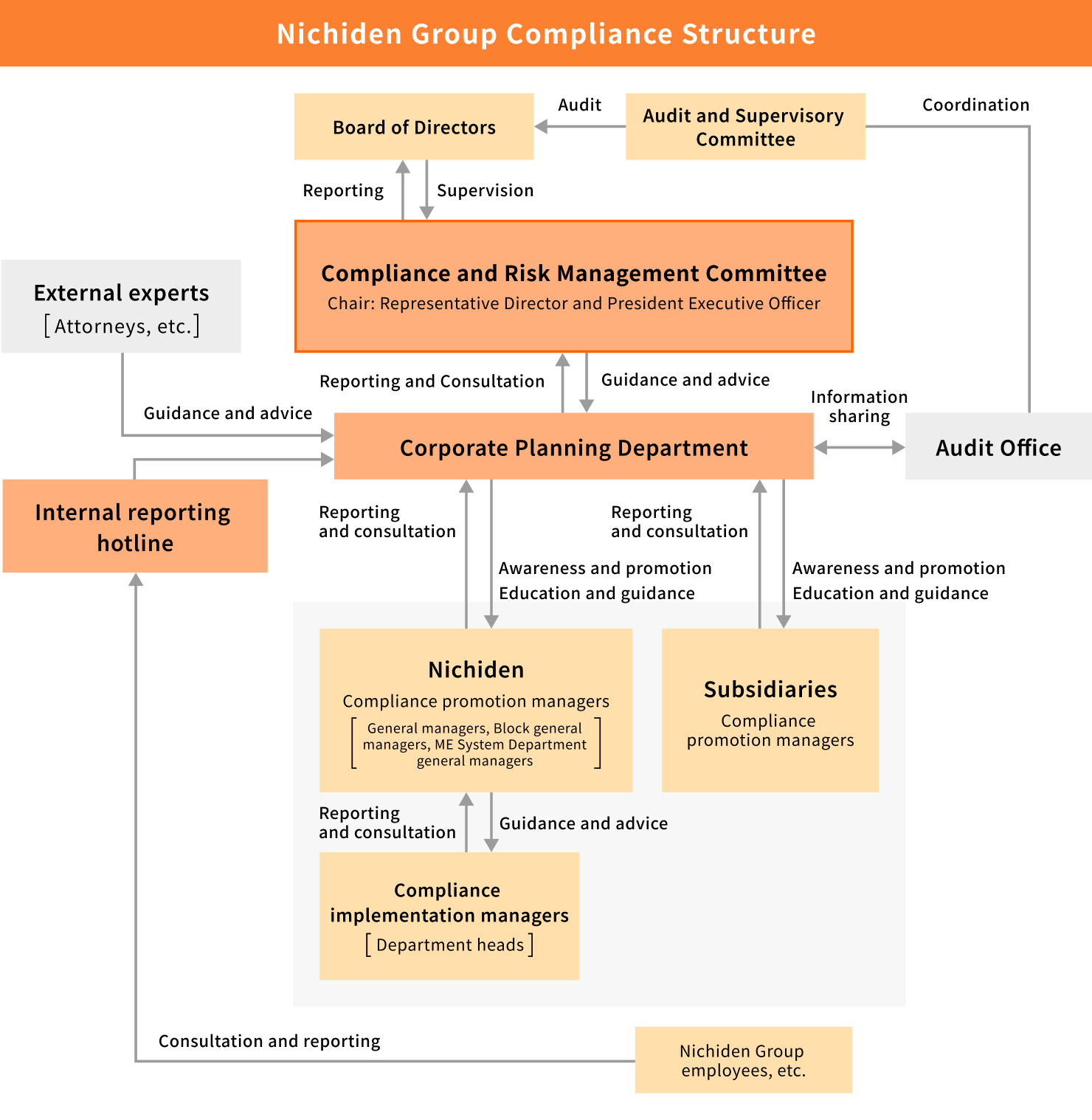 To strengthen compliance across the Group, the Nichiden Group has established a Compliance and Risk Management Committee chaired by the Representative Director and President Executive Officer. The Committee monitors compliance across the entire Group. The Board of Directors receives regular reports on matters reviewed by the Compliance and Risk Management Committee and oversees the compliance and risk management framework, verifying and evaluating its appropriateness and effectiveness. In the event of unforeseen contingencies, the Committee takes timely action in accordance with internal rules to minimize damage.