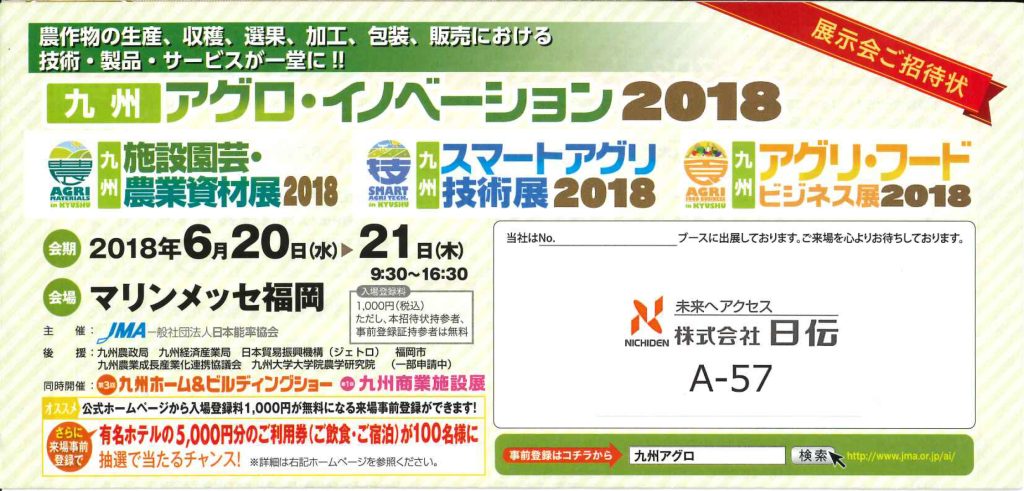 「九州スマートアグリ技術展2018(九州アグロ・イノベーション2018)」に、出展いたします。