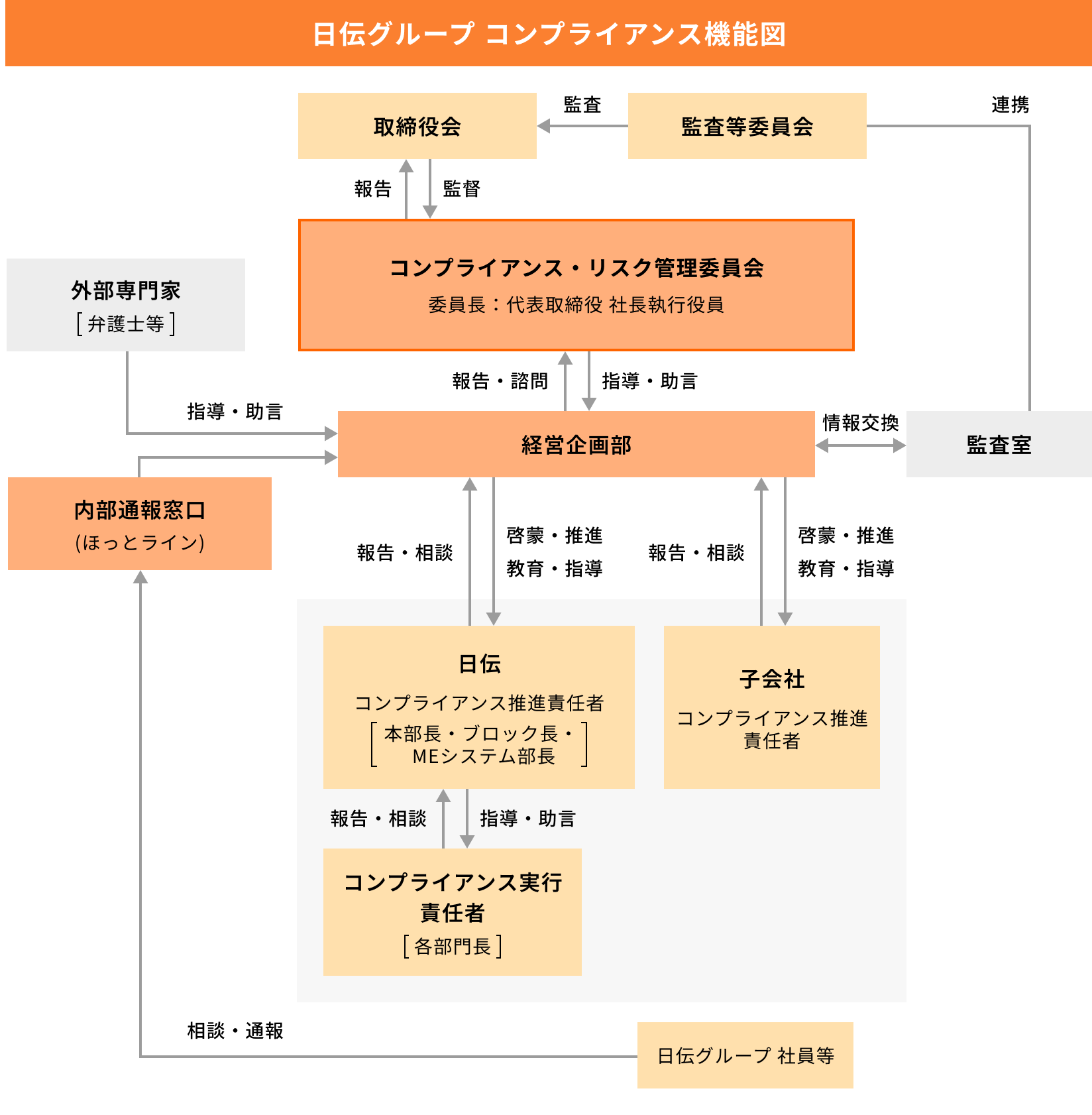 日伝グループが社会的責任を果たし、永続的に発展するためには、コンプライアンスの徹底が必要不可欠であると認識しています。コンプライアンスの徹底においては、当社の社是である「誠実」はもとより、経営理念・パーパス・行動指針・行動憲章に基づき、すべての役員及び従業員に「コンプライアンス行動ガイドブック」を配付しています。高い倫理観に基づく行動を社員に促し、ステークホルダーから信頼される企業となるべく取り組みを推進しています。